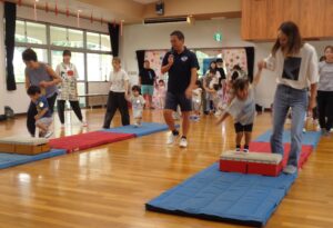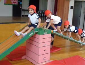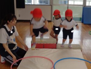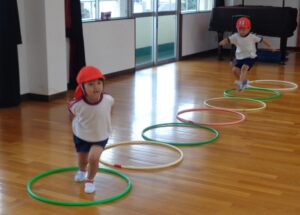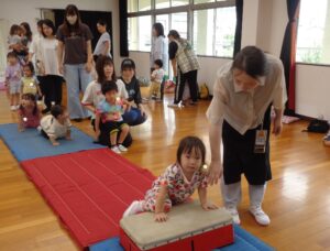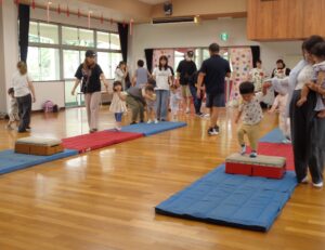 本日のなかよし教室は2学期初めての教室でした。マットと跳び箱を使いジャンプをしたり、ハイハイをしたりなど色々な動きをして楽しみました。年少組の体操はサーキット遊びをしました。どのお友だちも元気一杯に活動しました。今週も今日で終わりです。明日から三日お休みが続き、来週は火曜日が最初の登園です。火曜日に会うのを楽しみしています。