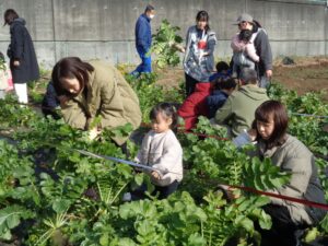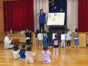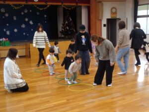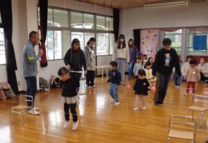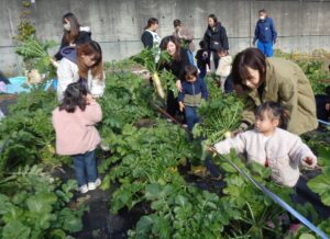 二学期最後のなかよし教室でした。ホールでは親子でジャンプをしたり、ケンパーをしたり体を動かして楽しみました。どのお友だちも元気一杯活動ました。体を動かし後は、「ネコのお医者さん」のパネルシアターを舞台で見ました。リズミカルな歌とお話しでとても楽しく過ごせました。ホールの活動の後は、子ども農園で栽培した大根を収獲しました。左右に揺すり大きく育った大根を収穫しました。ご参加いただいた保護者の皆様、ご家庭で美味しく召し上がってください。