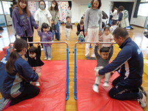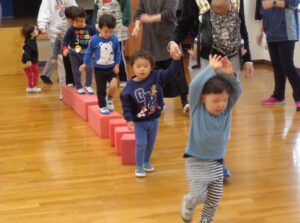 なかよし教室では、鉄棒やフラフープを使って体を動かしました。鉄棒では、どのお友だちも棒をしっかりと握り、体を支えることができました。体を揺らしたり、足を動かしたりと色々な動きをして活動しました。どのお友だちもとても楽しそうでした。体操の後は、笑顔・怒り顔など、色々な顔のまねっこをして楽しみました。上手に顔まねができるお友だちがたくさんいました。色々な顔まねの中でも、笑顔の顔まねがとても素敵でした。明日から二日間お休みです。来週も元気に登園して下さいね。