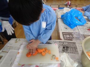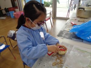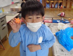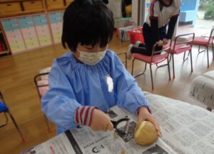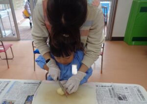 朝登園した子ども達から明日のカレーパーティーの準備をしました。これは、卒園に向けた行事の一つで、クラスごとに、ニンジン・タマネギ・ジャガイモを持ち寄り、登園した子ども達から野菜を切りました。包丁は危険なので、担任が寄り添い作業を進めました。切った野菜と購入した豚肉を鍋に入れ、職員室のガスコンロで調理を進めています。鍋からは、野菜を煮込む香りとカレールーの香りで食欲がそそられます。明日のカレーパーティーが今から楽しみですね。