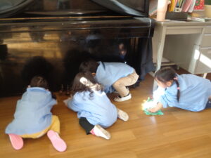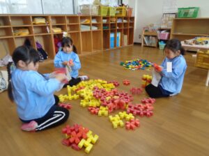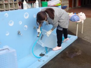 明日の終業式を前に大掃除をしました。クラスにあるおもちゃは水拭きをし自分のロッカーもゴミや埃を捨て整理しました。もも組さんも大掃除にチャレンジです。もも組さんは、クラスの床の雑巾がけをしたり、床や机・ピアノの椅子の下の汚れを落としたりしました。先生も子ども達と一緒に二学期間の汚れを落としました。明日の終業式は綺麗な教室で迎えられますね。