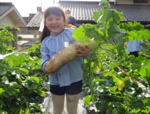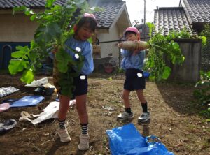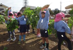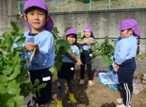 年長組さんが子ども農園で大根の収穫をしました。両手で抱えないと持ちきれないほど大きくなっていました。収穫した大根の土をとり袋に入れました。本日持ち帰りますのでご家庭で美味しく召し上がってください。