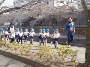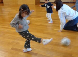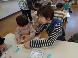 今日のなかよし教室も、ホールと教室に分かれて活動しました。教室では親子で工作に取り組みました。ホールでは、新聞紙を使って体を動かしました。どのお友だちも、お父さんやお母さんと楽しく活動しました。うめ組さんは、マラソン大会のコースを練習で走りました。700m近くのコースでしたが最後まで頑張って走りきりました。この後もマラソン大会の本番まで練習は続きます。