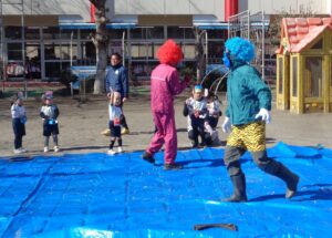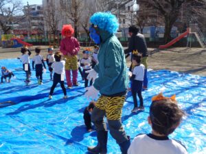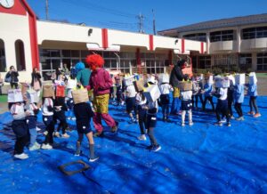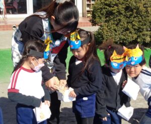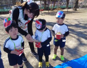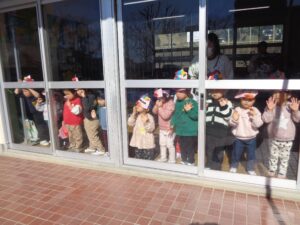 2月のお誕生日会の後に、節分の豆まきをしました。担任から福豆をもらい悪い鬼を追い払いました。小さい学年のお友だちは涙を流す姿もありましたが、全員で追い払うことができました。鬼を追い払うことができ、風邪など引かず元気に過ごせそうです。もも組のお友だちは窓から豆まきの様子と鬼を見ていました。