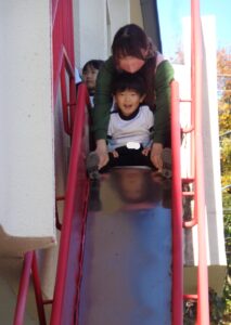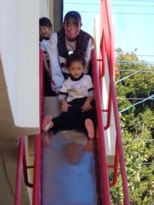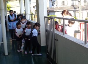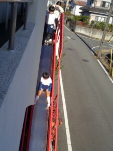 避難用すべり台を使って避難訓練をしました。クラスですべり方のレクチャーを受けたあと本番です。両足を開いて上履きでブレーキをかけスピードを落として避難しました。避難用すべり台の下には教員が待ち危険がないか確認しました。子ども達は静かに真剣に訓練に臨み、しっかりと安全に避難することができました。今回で5回目の訓練でしたが、どの訓練も真剣に臨んでいます。三学期にある最後の訓練は、消火訓練も併せた避難訓練です。
