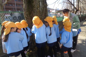 三連休が終わりました。ひまわり組さんは木を使った作品作りをします。今日は、作品作りの導入で園庭にある木々を調べました。叩いてみたり、触ってみたり、匂いを嗅いでみたりと、一本一本の木…