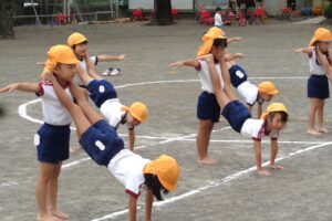 過ごしやすい一日でした。年長組さんは園庭で組体操の練習をしました。裸足で本番と同じように取り組みました。足の裏や膝に小石が当たり痛いと思いますが我慢して演技を続けました。年中組さん…