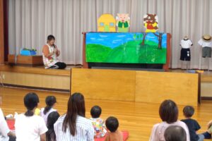 なかよし教室がありました。ピョンピョン跳ねたり、走ったりとホールの全面を使って活動しました。お友だちは走るのが大好きなようで力一杯走りました。たくさん動いた後は「三匹のこぶた」のペ…