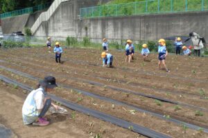 暑い一日でした。年長のひまわり組さんが、野菜の水やりと野菜の観察に子ども農園に出かけました。広い畑のサツマイモの苗にペットボトルに水を入れ一つ一つ丁寧にあげました。一人で何回も何回…