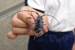 朝、カミキリ虫を捕まえたと見せに来てくれたお友達がいました。園庭の木の幹にいたそうで、白い点々があり「ゴマダラカミキリ」のようです。園庭では、たくさんのお友達が今日も元気よく遊んで…