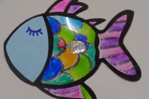 年長組さんの二クラスの様子を紹介します。一つのクラスは、虹色の魚を作っていました。初めに担任が「にじいろのさかな」の絵本を読み内容を確かめました。次に画用紙で顔を作りました。最後に…